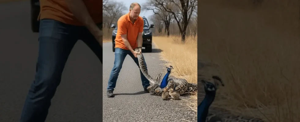 The scene unfolded on a dusty road, where a magnificent peacock, fiercely protective of her young chicks, found herself ensnared by a large python. The coiled serpent presented a terrifying threat, its powerful body constricting the mother bird while her tiny offspring huddled nearby, vulnerable and defenseless. The situation was fraught with danger, as vehicles continued to pass, narrowly missing the entangled animals.