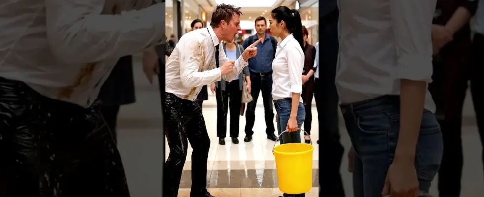 In the middle of a bustling mall, an elderly cleaner was quietly going about her work, mopping the floors. A man in a suit, absorbed in his phone call, walked by and, with a look of disdain, callously kicked over her bucket, spilling dirty water everywhere. He didn’t stop there; he smirked and gestured mockingly at the mess, leaving the woman standing in shock as her hard work was undone in an instant.